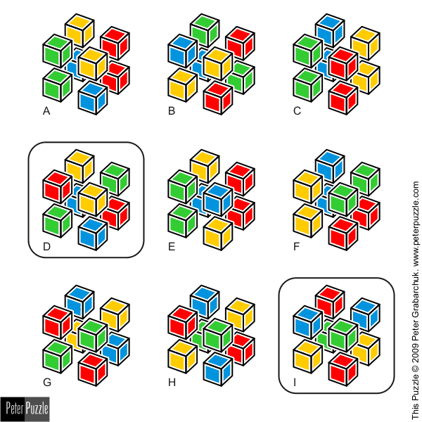 There are nine compositions (A to I) of eight colored cubes. Find two identical compositions. They can be rotated.
