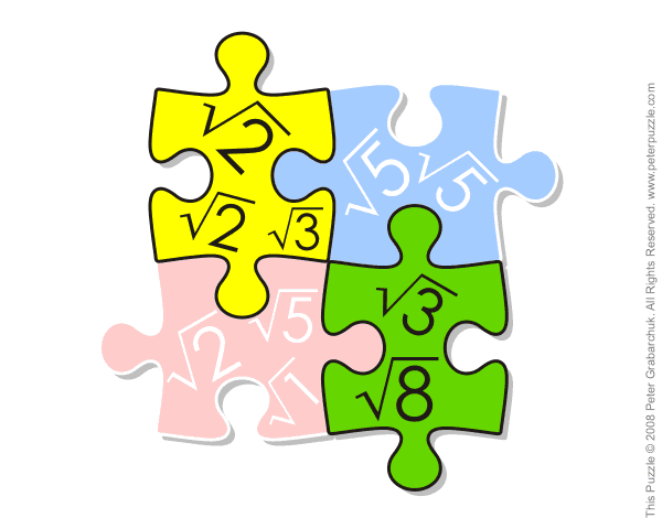 As sqrt(8) is the same as 2×sqrt(2), the yellow and the green jigsaw tiles have the same sum of their roots: sqrt(2) + sqrt(2) + sqrt(3) = sqrt(3) + sqrt(8).